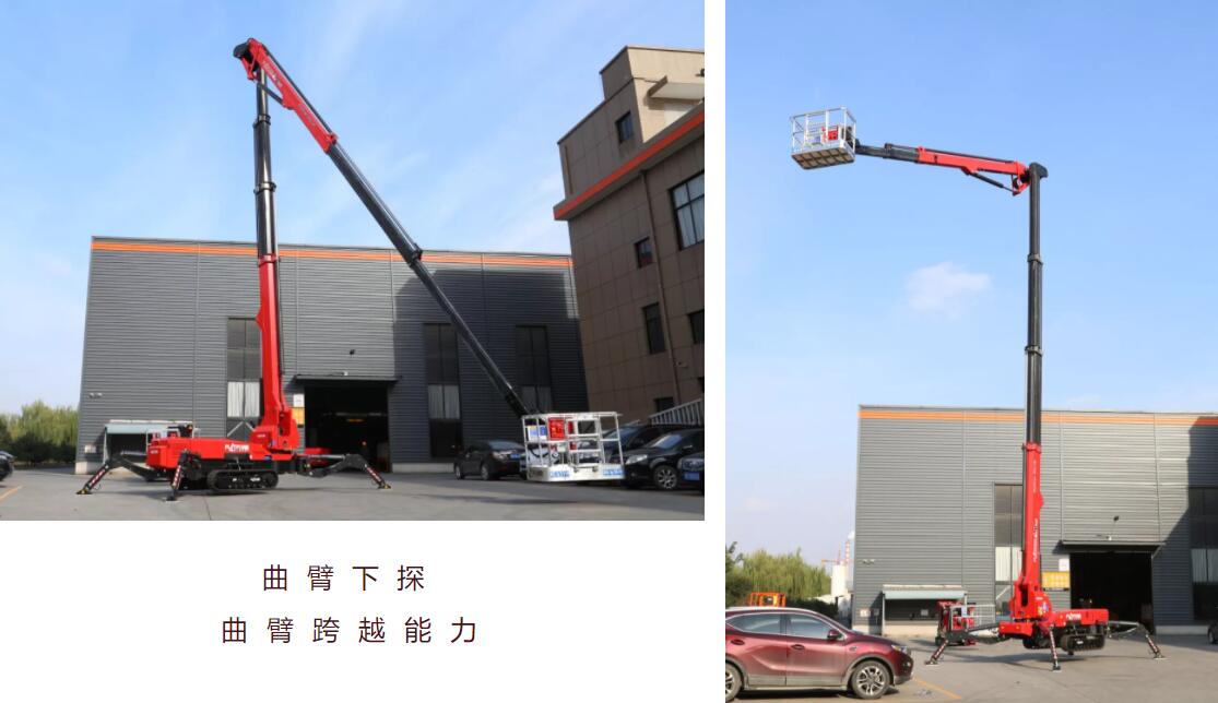 传统臂式工作高度超过15m往往尺寸偏大,稍显笨重,整机重量超过10吨。蜘蛛车采用履带式设计,车型紧凑,宽度不超过1.5米、高度不超过2米,即便是工作高度到达30米,其重量基本也不超过5吨,不仅运输方便,还可轻松进出房屋,通过性强。
