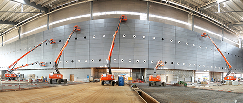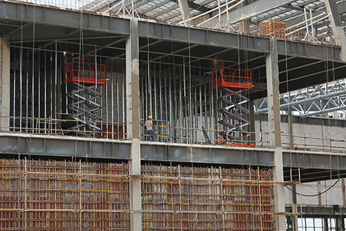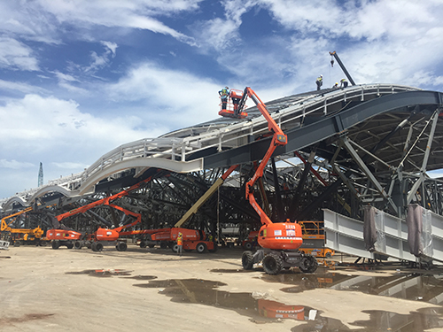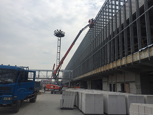 现在,距大会召开仅有4个多月时间,会址按要求力争在8月底建成。时间紧,任务重。工程涉及大量复杂的高空作业,如果用脚手架,搭拆都费时费力,工作时又不方便,并且效率一般。而高空作业平台则优势明显:升降灵活,操作人员可轻松进出受限空间;机动性极强,能够便捷迅速转换作业地点,尤其适用于多点位高空作业。