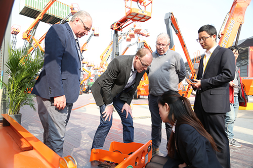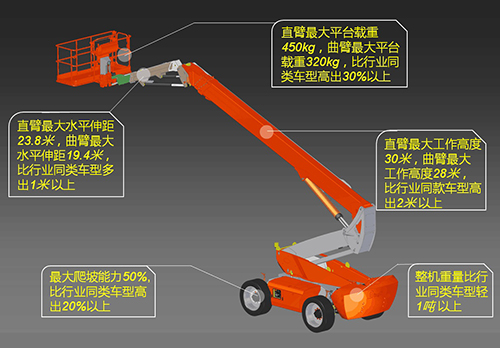 1- 家族模块化设计 - 臂式系列新品95%以上的主要部件通用,80%以上的结构件通用, ① 便于制造工厂自动化生产安排, ② 装配单一性,差错率低,效率高,适合流水线批量生产, ③ 主要部件及结构件规格型号统一,租赁公司客户仓储成本轻, ④ 租赁公司客户维护维修成本和配件仓储成本低, 2- 差异化设计 - ① 配置德纳工程机械车桥底盘,道依茨发动机(欧Ⅳ,欧Ⅴ可选),丹佛斯液压PVG控制系统等品牌零部件,全面提升产品性能, ②下沉式设计:整体部件下移设计,将发动机,油箱,配重等部件下移,降低重心,使产品更稳定,所有部件位于底盘两侧,方便维修保养, ③轻量化设计:整机采用全球专利保护的结构设计,结合高强度材料的完美应用,与老款车型相比,平台最大载重高出30%以上,最大工作高度高出2米以上,重量均轻1吨以上, 3- 个性化设计 - ① 可选配液压发电机 西瓜影院免费观看, ② 标配平台防挤压安全保护装置, ③ 可按客户要求提供不同颜色产品, 鉴于独特的外观设计,领先的技术优势,来自美国,法国,荷兰,土耳其,日本,新加坡,泰国等国际知名租赁公司及代理商客户纷纷驻足鼎力展区,重点了解了臂式系列新品,场面尤为火爆。