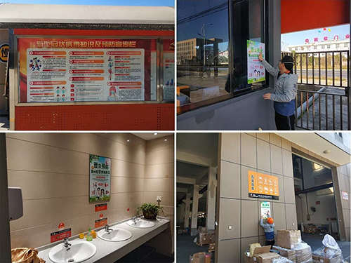 为保障员工身体健康,春节期间,宣传部门便加班加点在各个厂区拉起防疫工作横幅,张贴疫情防范的注意事项,行政区域、公司食堂、各个车间防疫相关内容随处可见。