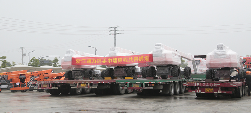鼎力三期厂区的发货现场,数台直臂式高空作业平台整装待发,即将交付中建锦程机械设备有限公司。