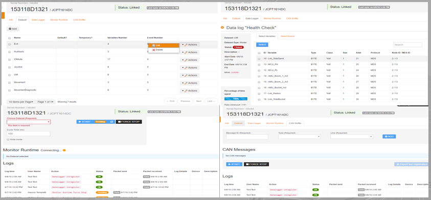 实现了一套程序可覆盖8款机型的应用:电动取料机、半电动取料机、电动剪叉系列、发动机款越野剪叉、发动机款臂式、套筒式,客户只需要选择相应的车型图标,就可以实现一键切换车型,操作手可根据人性化图形界面轻松实现设备的故障检修,功能的特殊定制等。突破了原先简单的故障维修需要通过专业技术人员来维护的技术难点,大大减少了租赁商的运行维护成本和配件管理成本。