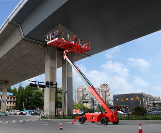 这是位于杭州市某高架施工现场,也是杭州为迎接即将到来的G20峰会而进行的市政、建筑提升改造的项目之一。细心的小伙伴会发现,在这个工地上,除了这个带有浙江鼎力LOGO标识的大家伙外,普通工地常见的脚手架竟然不见踪影。好奇的小伙伴不禁要问:没有了脚手架,这个大家伙能行吗?施工能安全吗?工期能保障吗?