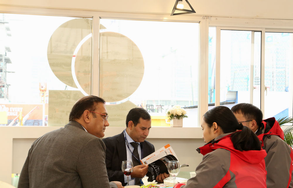 在洽谈区,来自不同国家、不同语言的参观客户汇聚一堂,人流如织。鼎力销售人员以热情的服务为客户提供专业的产品介绍。