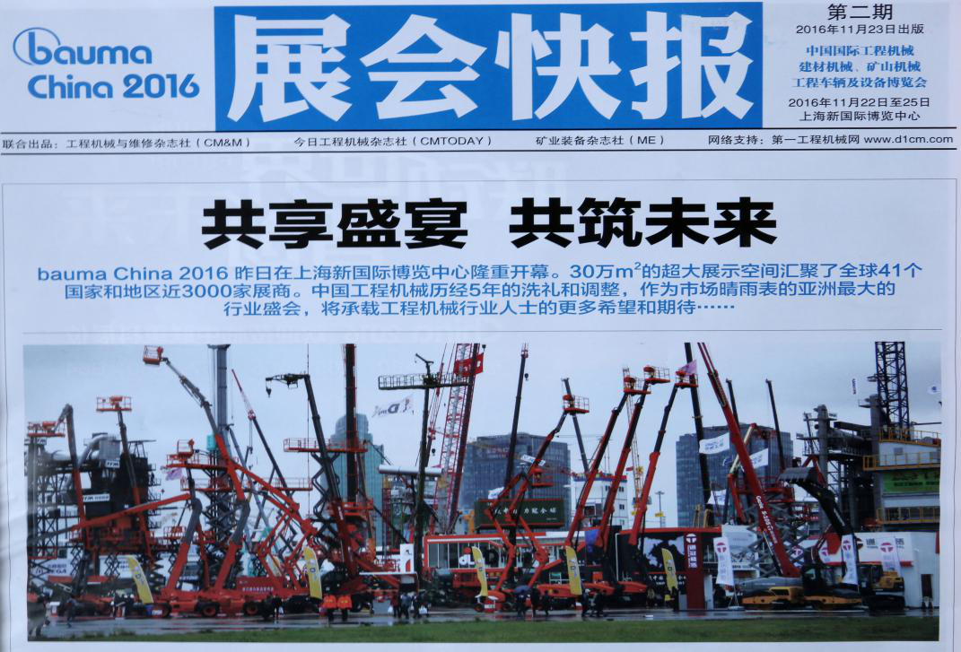 此外,浙江鼎力的强大参展阵容,吸引了国内外数十家主流媒体争相报道。宝马展官方会刊更是将浙江鼎力展区大幅照片放在头版予以重点推出。