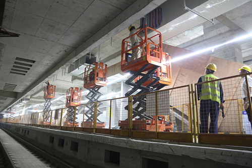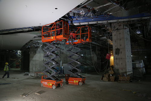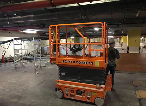 该医院项目内部楼层间,普遍层高为3~4米,中大型高空作业平台大材小用,结合实际作业环境,该项目选取了具备通过性强、可灵活进出客梯等优势的小剪叉平台,在小剪叉平台的助力下,医院内部装饰工程快速推进。施工案例----香港某商场地下车库