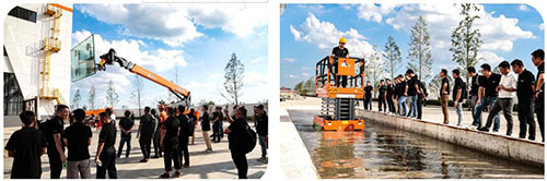 随后,大伙重点聚焦了电动臂式系列演示、大吸力玻璃吸盘车演示、高防水双交流剪叉演示等。对于主角电动臂式,不少客户更是亲自上车体验。